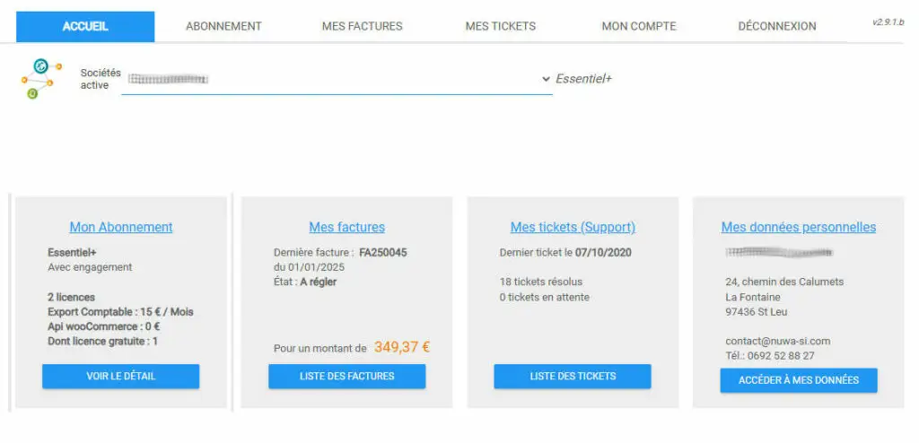 Depuis cette page d’accueil, vous disposez d’un résumé de votre abonnement myKomela ainsi que des informations sur la facturation en cours, vos tickets de support et vos données personnels enregistrées pour votre facturation. Vous pouvez obtenir plus de détails en cliquant sur les boutons bleus de chaque bloc.