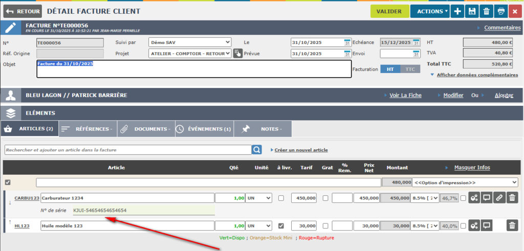 - l’enregistrement des numéros de série directement dans les factures pour les articles vendus,