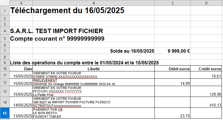 - on retrouve bien les informations de notre exemple de fichier Excel, dont le Solde du compte qui était indiqué en en tête dans notre fichier Excel,