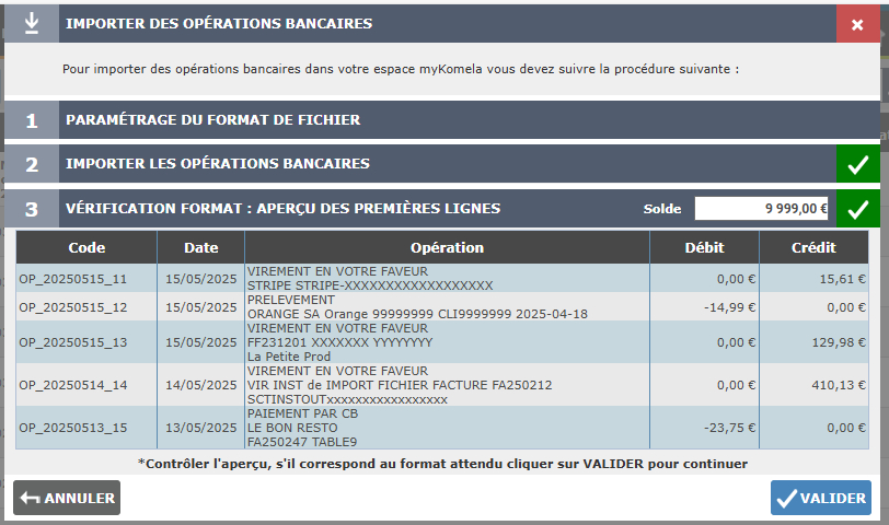 - myKomela vérifie le fichier fourni et affiche un aperçu des 1ères opérations bancaires du fichier. Cela vous permet de vérifier que vous n’avez pas fait d’erreurs.