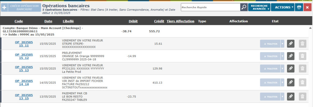 - vous positionnez sur la liste des opérations bancaires (menu « Pré-Comptabilité/Opérations bancaires »),