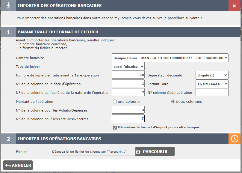 - la popup de paramétrage de l’import des opérations bancaires depuis un fichier Excel ou CSV s’affiche,