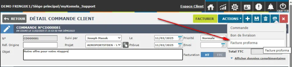 myKomela vous permet d’éditer une facture PROFORMA depuis une commande.