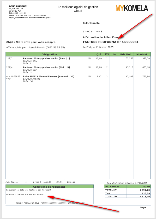 Si un acompte a été enregistré sur la commande, cet acompte apparaîtra dans l’édition de la facture PROFORMA.