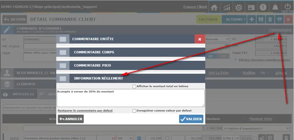 Vous pouvez également préciser les conditions de règlement prévus depuis le lien « Commentaires », onglet « Informations règlement ».